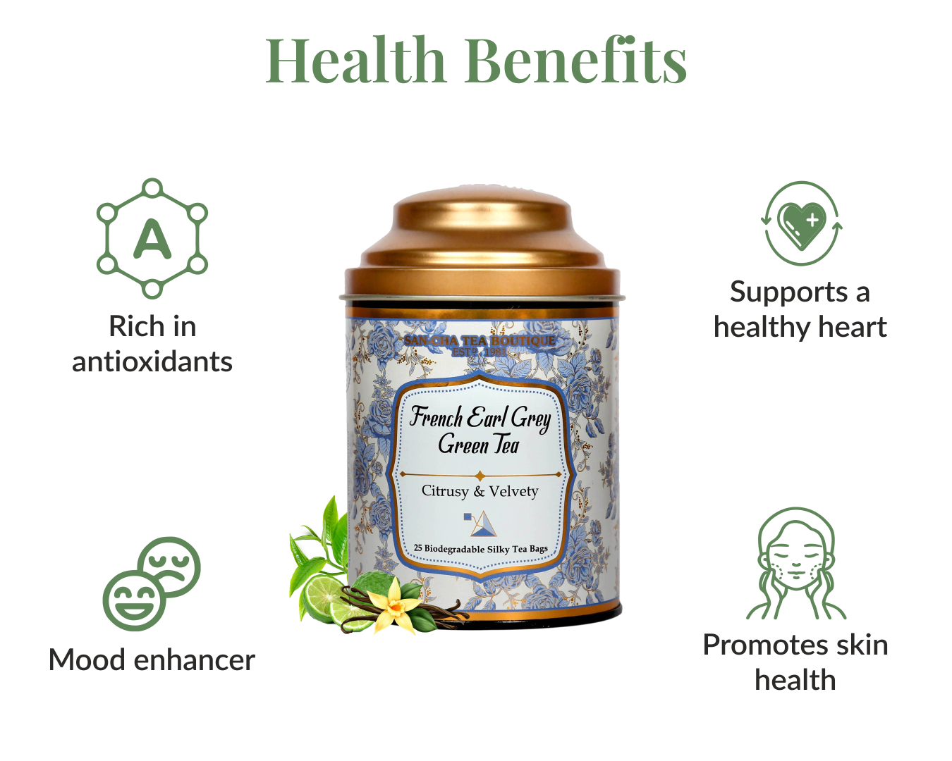 Indulge in a luxurious twist on the classic Earl Grey. At SAN-CHA, our Master Tea Taster has blended velvety vanilla with the crisp, citrusy brightness of bergamot, layered over antioxidant-rich Indian green tea.