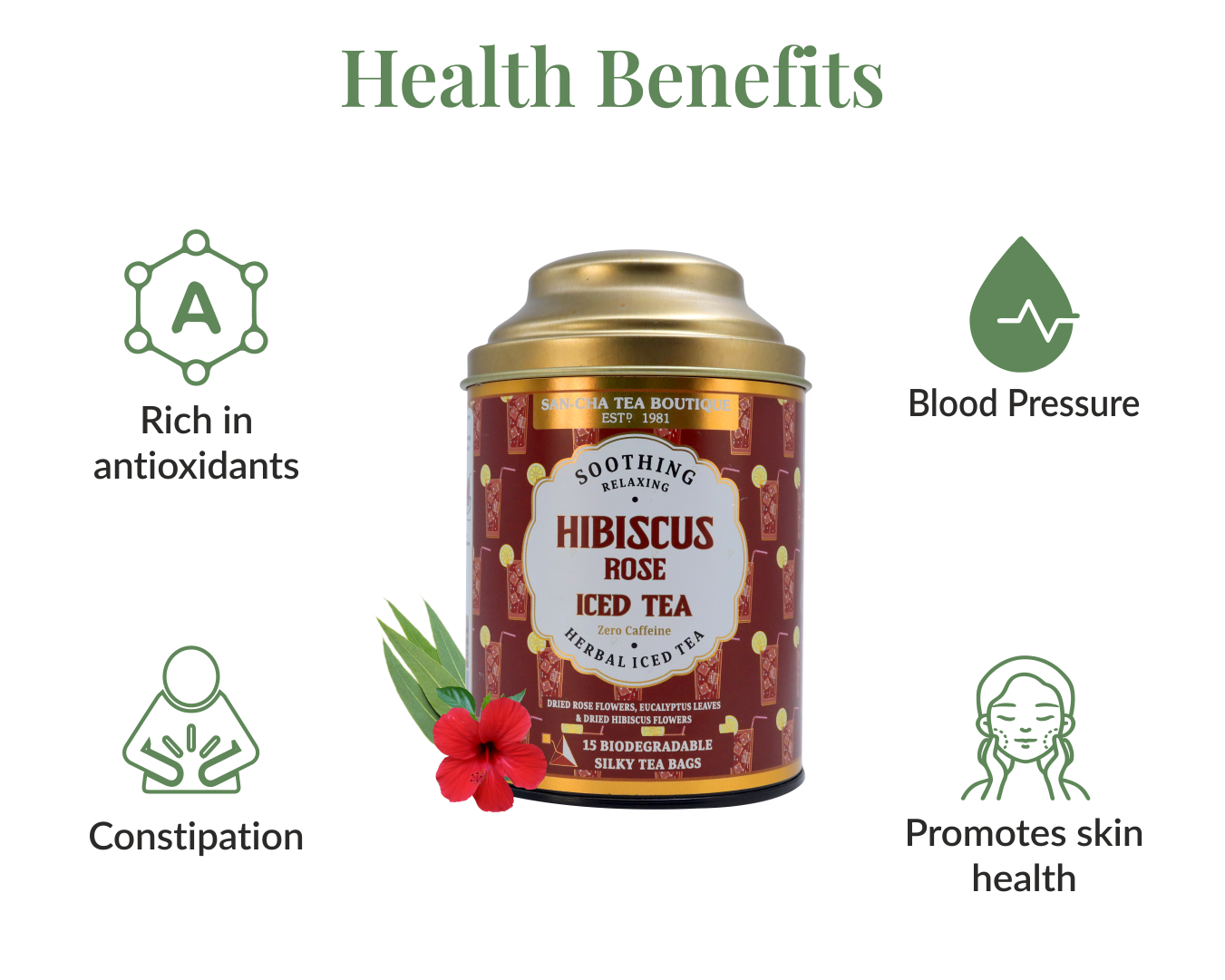 Hibiscus – Naturally rich in vitamin C and antioxidants to promote skin elasticity, hydration, and a youthful glow.