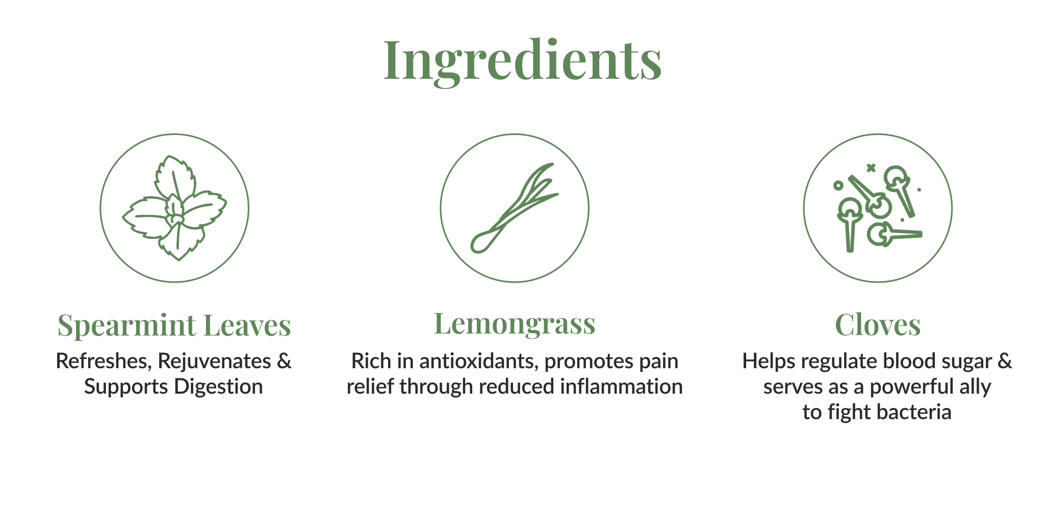 This blend combines the cooling freshness of spearmint, the warm spice of clove (rich in eugenol), and the bright citrus lift of lemongrass. Together, they create a layered, soothing, and aromatic infusion that is 100% caffeine-free – perfect for any time of day.