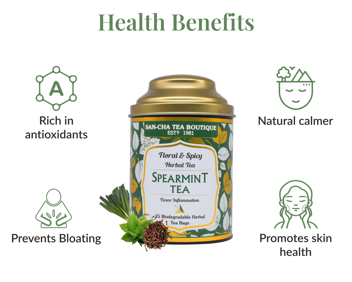 Experience a refreshing twist on a classic mint tisane with Spearmint Clove Lemongrass Herbal Tea, handcrafted in small artisanal batches by SANCHA’s Master Blenders.