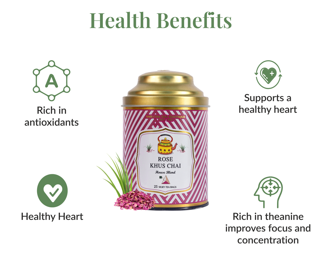 Revered for centuries in Indian palaces, khus is prized for its natural cooling fragrance, while rose petals lend a delicate floral lift, long celebrated in Ayurveda for promoting beauty and skin vitality. Together, they create a luxurious chai that is both refreshing and indulgent.