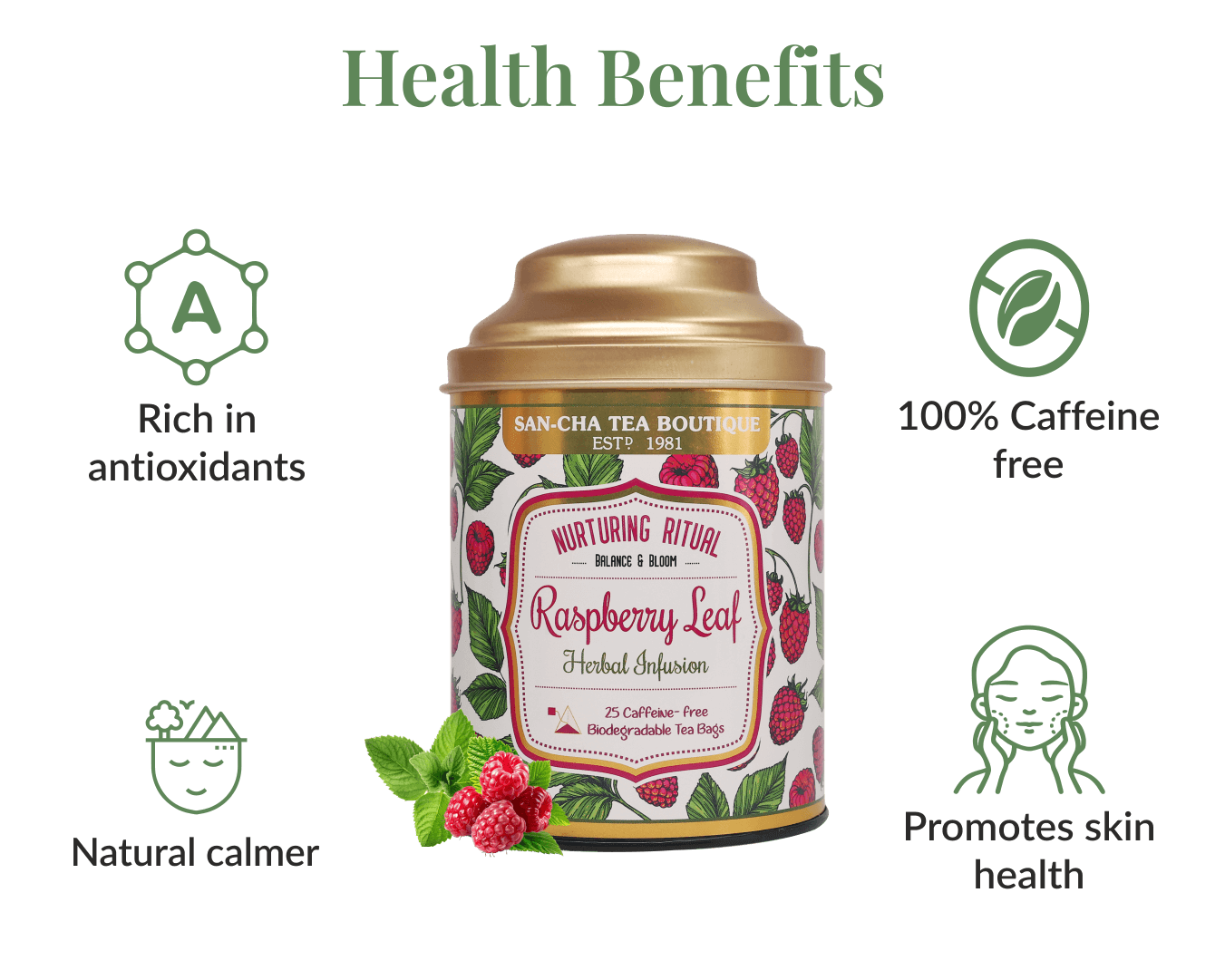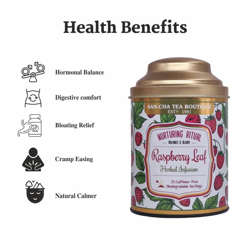 Traditionally cherished in women’s herbal rituals, raspberry leaf is valued for promoting natural balance and comfort, while peppermint brings a bright, uplifting freshness that soothes the senses. Together, they create a calming yet revitalising tea perfect for mindful moments throughout the day.